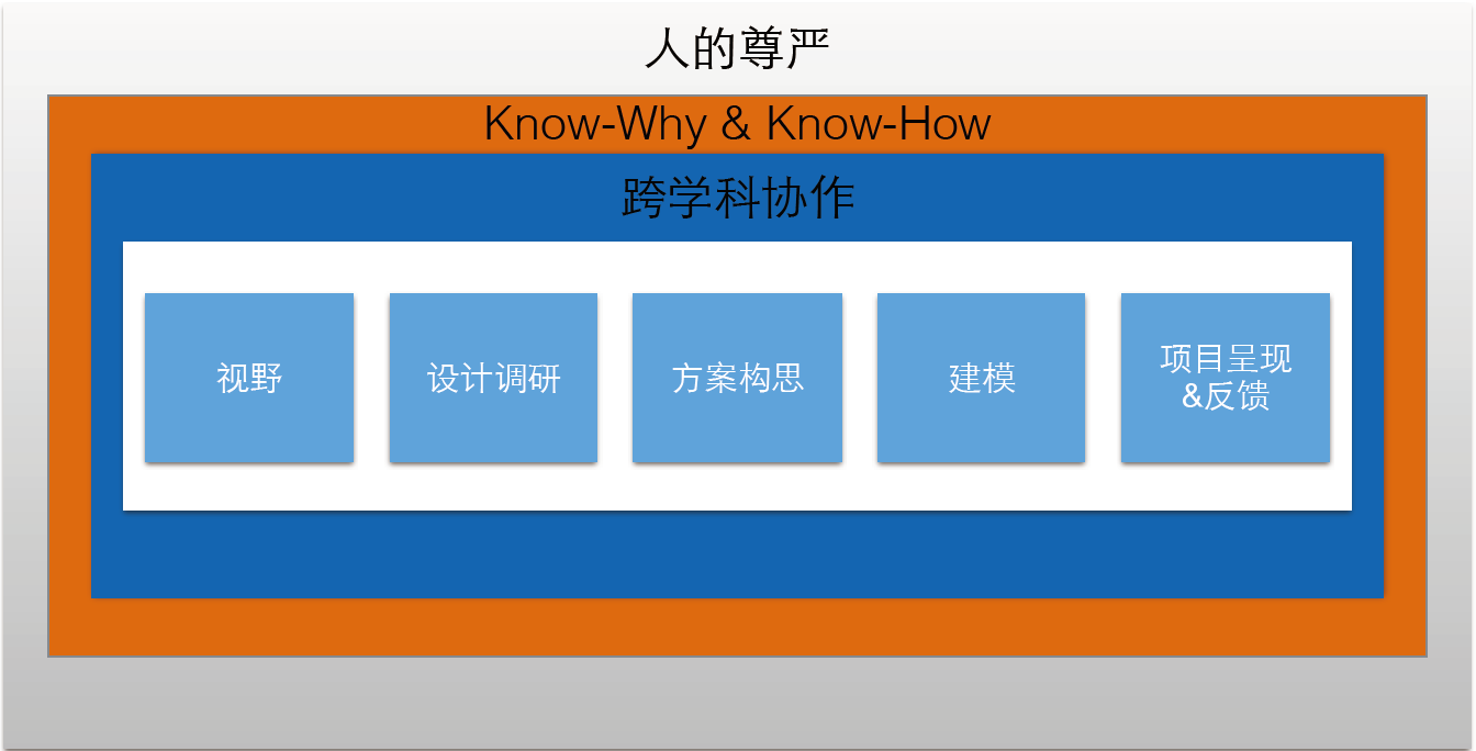 设计师的设计能力在很大程度上取决于个人视野,在整个课程体系中,将在项目的每个阶段提炼给学生跨学科知识以及其解析角度,在延展知识库的基础上激发学生的创造力和解决问题的能力。具体内容将涉及到协作与沟通、求解性思维、系统性思维、服务与体验等。