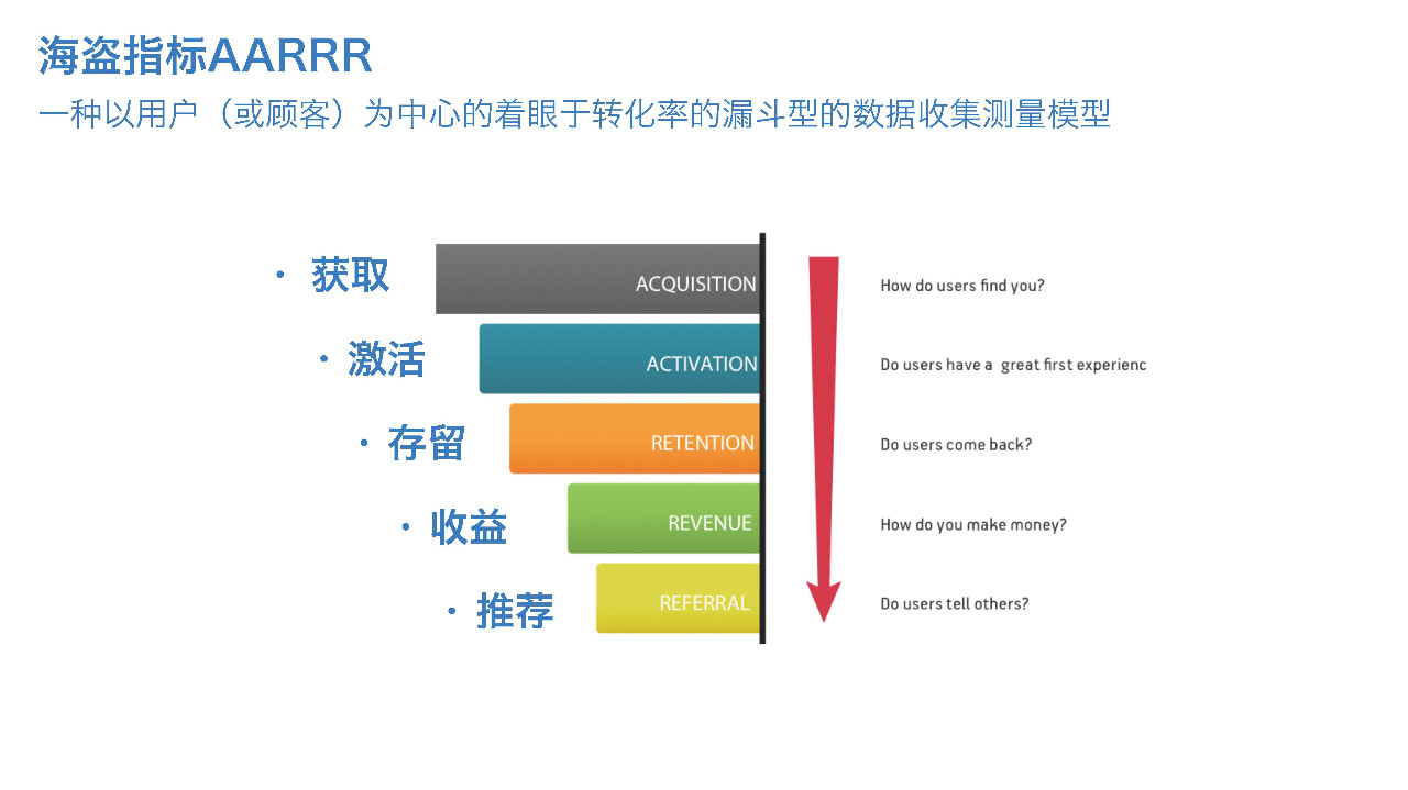 海盗指标(AARRR Metrics) 是硅谷著投资人以及创业家DaveMcClure在2008年提出的方法。他的本意是用此指标分析新产品和新公司的可行性。在近几年来,这个方法已经被人们不断演化,使它在产品设计和用户体验研究里也广泛应用,很多公司还将它作为公司唯一的用户体验量化指标,用以统一设计目的和商业目的上的潜在冲突。