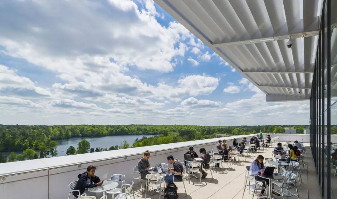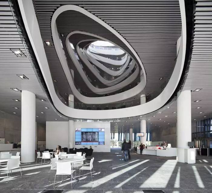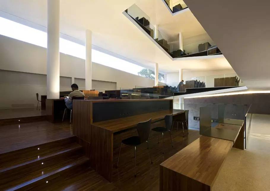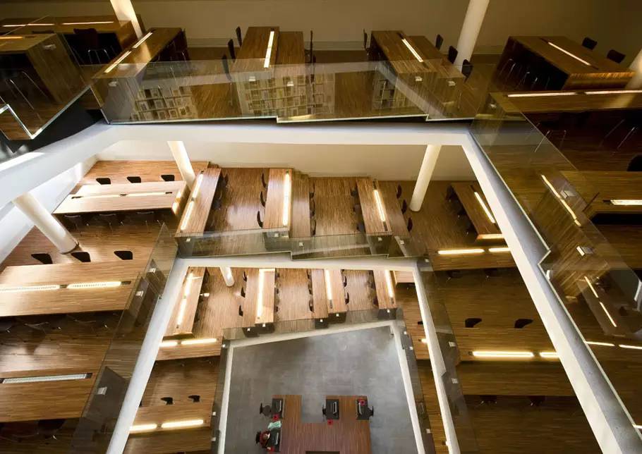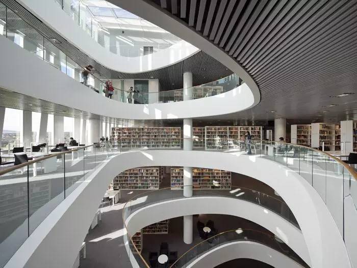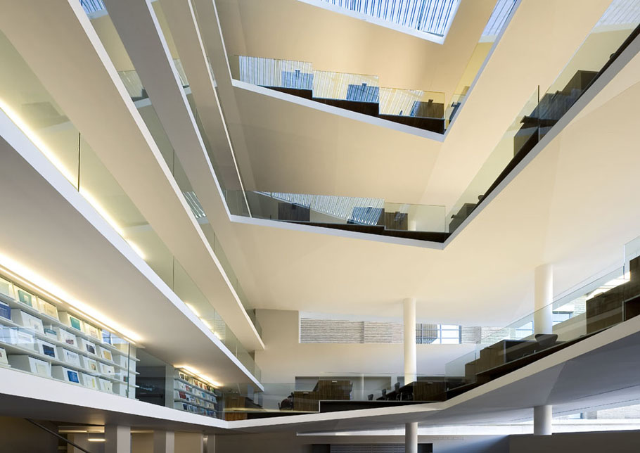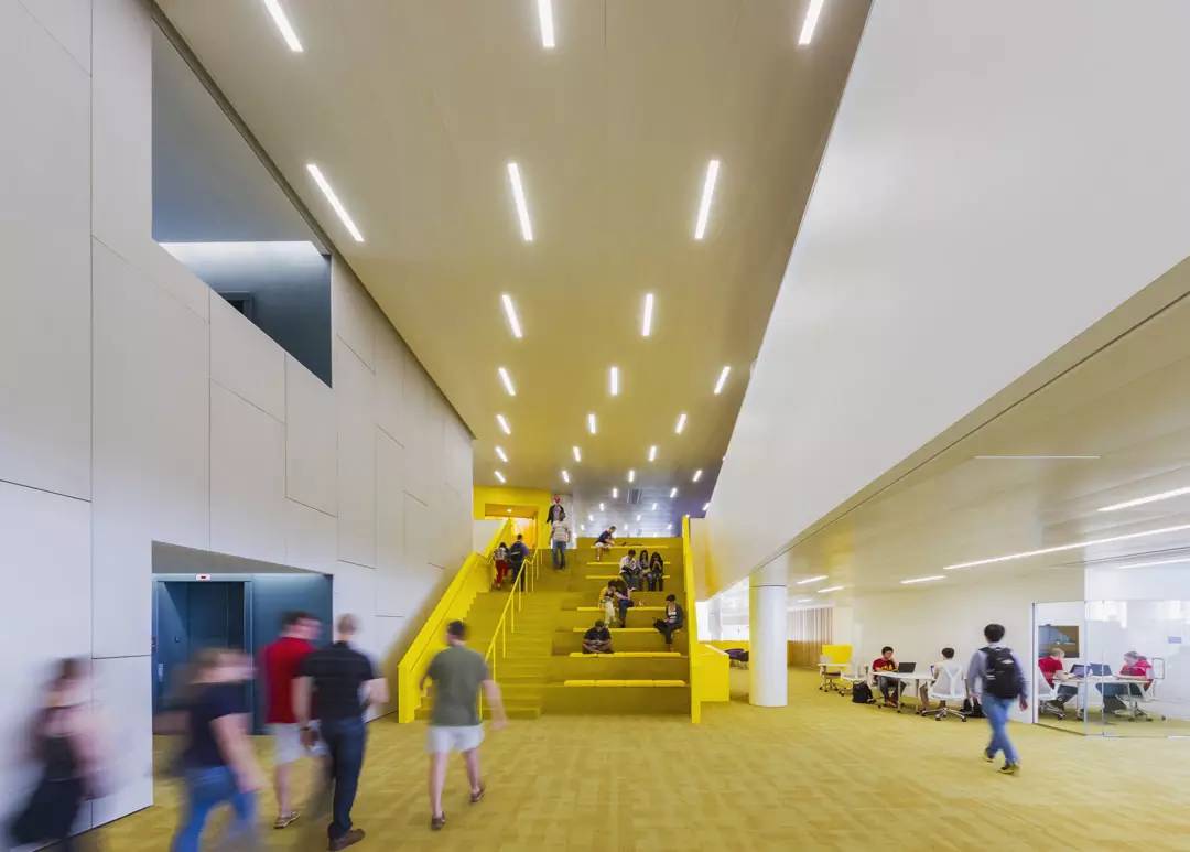 一个连接大学和城市并成为大学东西轴线西端起始的新公共广场也是这个设计的一部分。这个广场增加了大学和周边社区的凝聚力。设计明朗,招人喜欢。休息室和咖啡厅层回定期举办展览,研讨会还有诗歌朗诵。中央的挑空穿越8层,直达屋顶,其有机的形式与外表干净轮廓体量形成鲜明对比。