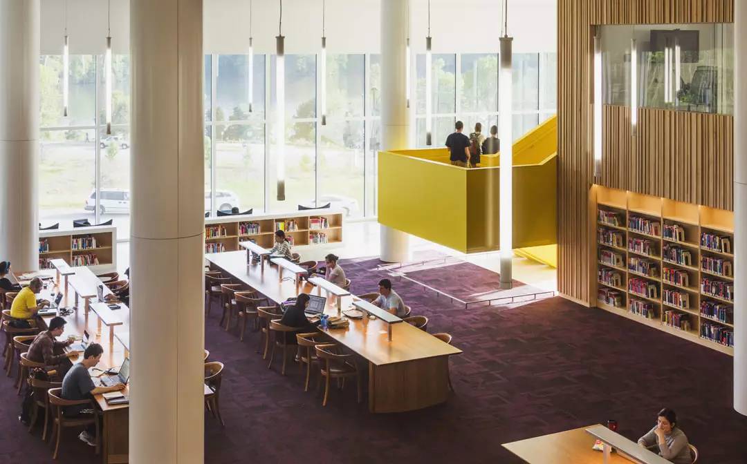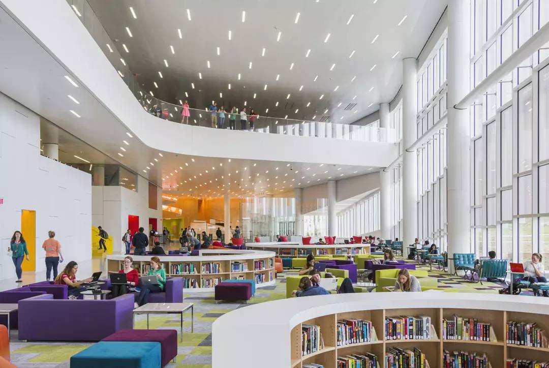 亨特图书馆在校园中影响力巨大。动态流动的内部空间为人们提供一个具有前瞻性的智慧场所,一个多功能和有趣的学习及创新环境。主要的楼层间拥有开阔的中庭空间,开放式楼梯联系上下,各种各样的研究室和学习环境并存在“学习共享”的理念之下。丰富多彩充满活力的家具出现在空间各个角落。同时,这个建筑所具有的汇聚的力量,让人们在这里因交流而收获更多。