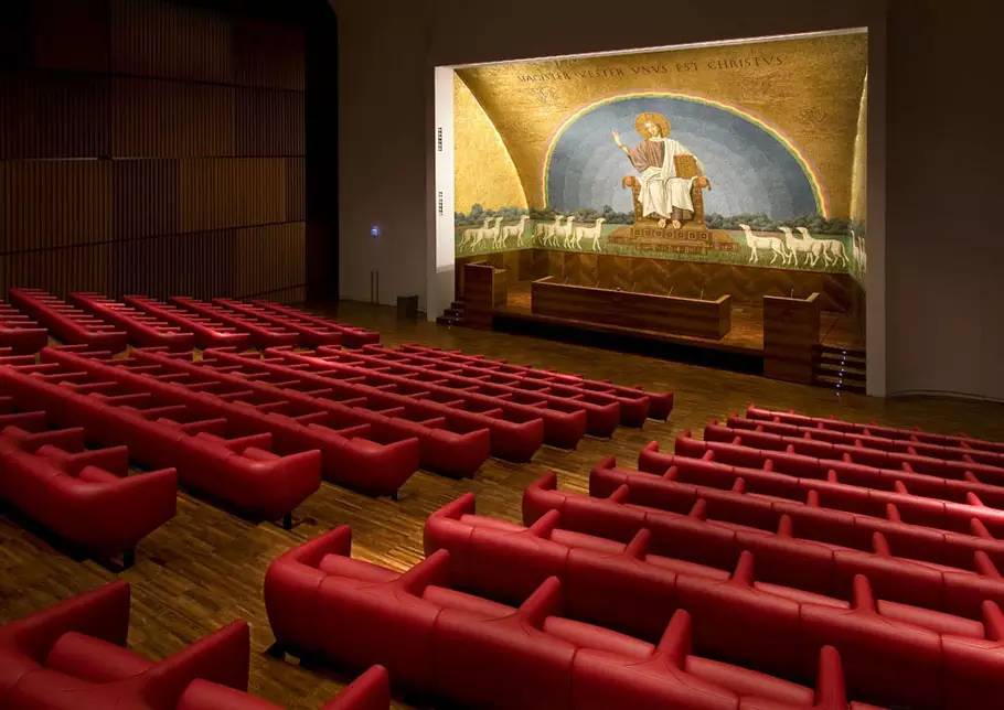 礼堂改建得符合现代标准。无论是设备,声学,还是安全性,舒适性都满足需求。两侧的木墙格栅不仅吸声效果良好还可以控制光线进入。红色宽大的圆角扶手椅符合人体工程学,表面的皮革由传统工艺完成,相当考究。