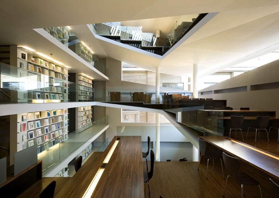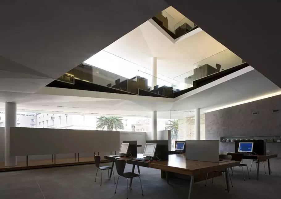 Pontificial Lateran大学的图书馆扩建和礼堂重整项目。这个内部地面是盘旋斜坡的新图书馆与老馆密切相连。新馆中盘旋的斜坡围绕中庭上升,阅览区就安置在斜坡上。