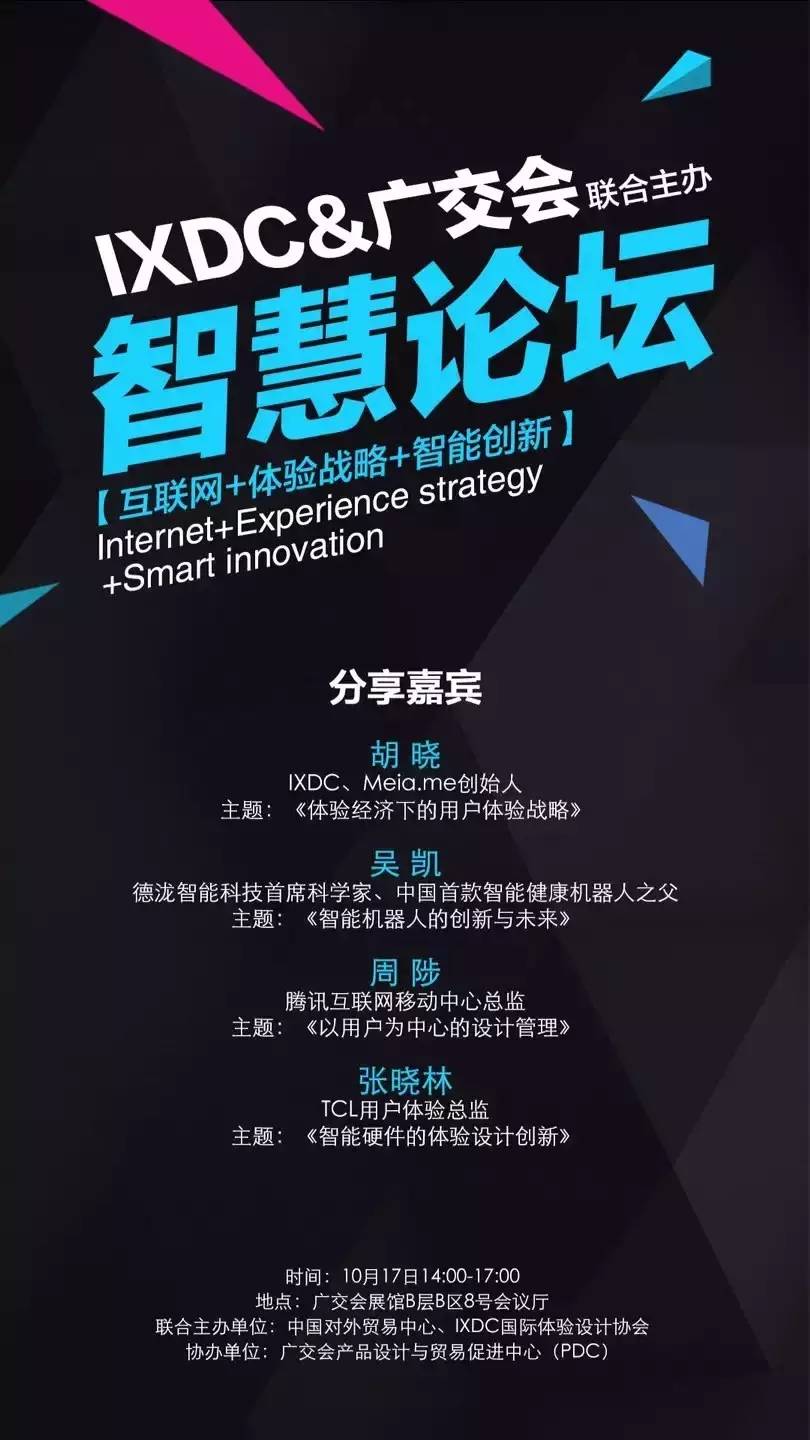 以智能创新、用户体验为核心的互联技术革命正在颠覆传统产业,体验至上、智能互动的家电电子产品越来越受国际市场青睐。为积极推进“智慧广交会”建设,加强企业对智能创新、用户体验的认识与关注,中国对外贸易中心将联合IXDC国际体验设计会共同主办主题为“互联网+体验战略+智能创新“的智慧论坛。