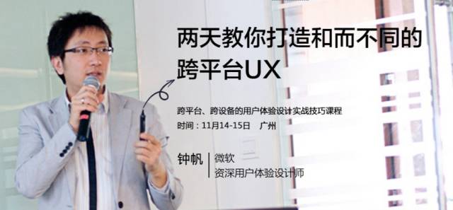 主讲人:钟帆,微软资深用户体验设计师。十余年的从业经历中,拥有Web、手机、PC、智能电视、Table PC等多平台的设计经验。曾参与世界上第一款E-ink手机Motofone、摩托罗拉为中国市场设计的第一批Android手机、联想第一款桌面交互设备Horizon等明星产品的用户体验设计工作,主持过多个跨平台、跨设备的大型设计项目。