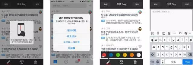 第5种,摇一摇:严格意义上这是打开反馈功能的交互方式。传统方式是通过一次次的点击,一级一级地打开子界面,最终打开反馈功能的用户路径方式。而借助移动设备的特性,一些 app 则做出了创新性的尝试。比如知乎可以通过摇一摇的方式,启用反馈功能,直接在当时的界面上进行画线、添加文字等操作。并且提供了关闭摇一摇反馈的选项。