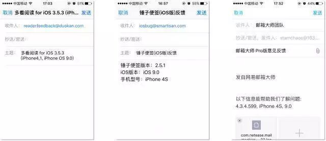 尽管如此,从细节之处还是能够比较出不同产品对于这项功能设计的高下,比如邮件的主题、正文、附件等,甚至是否自动弹出键盘这一细节。比如下面三款 app:多看阅读、锤子便签和刚刚推出的网易邮箱大师 Pro。邮箱大师会自动弹出键盘,这里的截图是为了展示其附件中的日志文件。而多看阅读的邮件主题最为用心,标明了 app 的版本号、手机型号和系统版本,有利于产品团队相关成员对邮件的初步分类。在点击“取消”时,并非所有的 app 都会弹出“是否保存”的选择窗口(网易邮件大师就直接返回了)。这里也体现了产品设计对用户反馈的重视,避免误触。