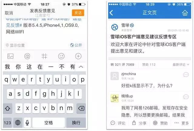 第4种,结合产品本身特性。由于越来越多的产品添加了社交功能,因此在用户反馈这一功能的设计上也越来越用心,将用户反馈直接与产品的社交功能相结合,给用户一致的体验。比如左图的微博,采用发微博的方式,并 @微博iPhone客户端 等相关帐号;右图的雪球则采用直接在“反馈专区”的帖子下进行评论的方式。