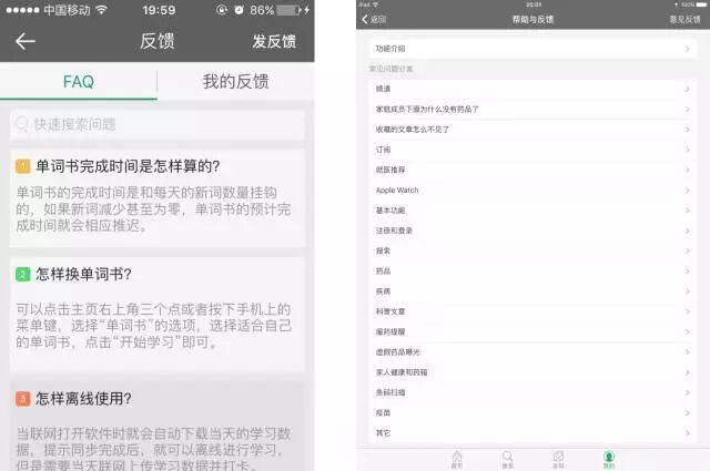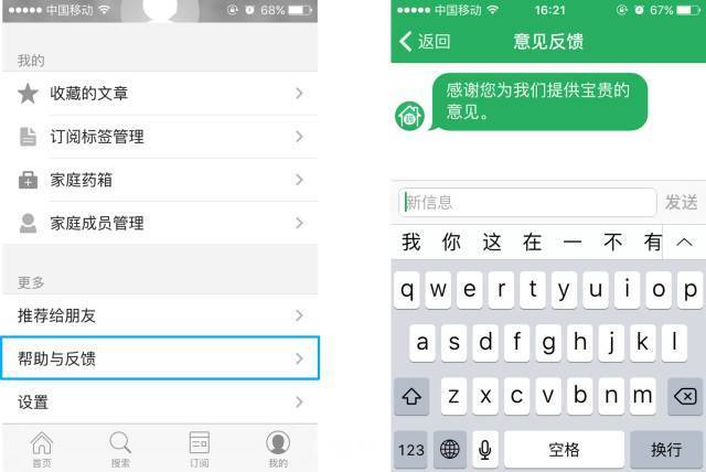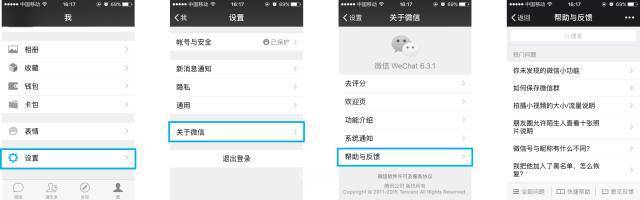 「用户反馈」功能也是如此,通常来说这跟应用的类型(社交or专业工具)和所处的生命周期(通常表现为用户数量)有关。一般工具类 app 的用户路径较短,而社交类 app 的用户路径较长。例如下图所示的微信和家庭用药(丁香园出品),不包括打开应用这一步的话,前者需要4步,后者只需要2步: