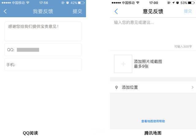 第2种,填写表单:本质上讲和第1种发送消息其实是一样的。这是过去大部分app所采用的交互方式,通过需要填写邮箱、联系方式、具体情况等信息;现在基本有了不同程度的改进和变体。比如左图的QQ阅读,采用了最基本的表单形式(表单本身的设计也有问题,如QQ/手机未提示是否必填);而右图的腾讯地图使用了文本输入框和上传图片两个控件,并且可以添加当前地理位置,使得用户的反馈更加完善有效,有利于排查和解决问题。在细节设计上,文本输入框右下角有可输入字数提示,页面底部有地图使用帮助的链接,为那些懒得反馈又想解决问题的用户提供了帮助通道。
