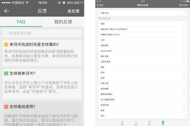 下面分别是扇贝单词(左)和丁香医生 iPad 版(右):