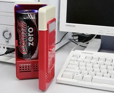 USB迷你冰箱,靠USB口供电的冰箱,这个冰箱太小了,只能放进一罐饮料,它可以让你在使用电脑的时候顺手喝一杯冰镇的啤酒。