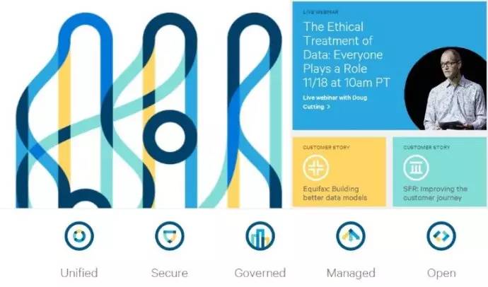 看看Cloudera吧,首页不同部分(首页三屏中不同部分的截图对比)的关联是不是感觉很像是电影中的隐藏剧情般引人入胜呢?黄、蓝、绿三种颜色的不同处理方式(交融、分离、叠加)构成了整体页面既统一、个性、又有巧妙联系的视觉语言。