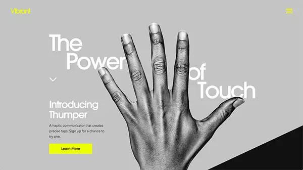 以Vibrant 的网页设计为例,他们的首页中背景和图像都采用的是黑白色调,但是LOGO,按钮和汉堡图标都采用的是闪亮的黄色,它们可以很快抓住用户的注意力。