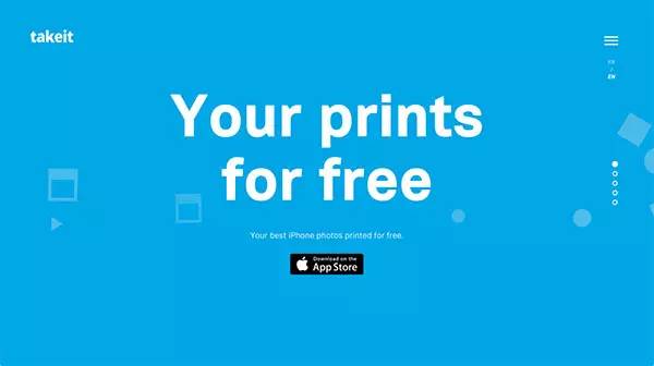 Takeit 的页面设计同样如此,整屏的蓝色背景让白色的网页元素显得非常明显。白色的大标题是视觉重心,然后用户会注意到标题周围的App Store按钮,LOGO和汉堡菜单。