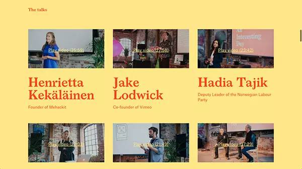 An interesting Day 是为一个“在奥斯陆峡湾的小岛上上为期一天的奇怪小型会议”而设计的网站。黄色背景上用红色文字的网站并不多见,配合着个性十足的图片,整个网站所有的设计元素都是在为你阐明“奇怪”的特色。