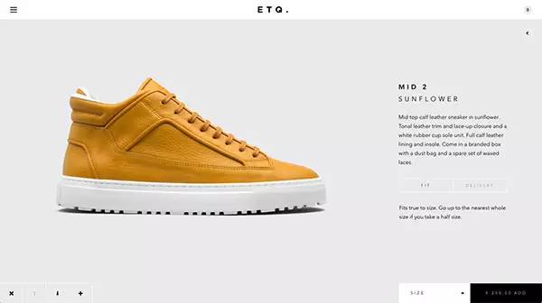 说道让产品,ETQ也同样让产品优先级压过UI,极简的网站设计风格之下,配色方案显然是延续自产品配色。设计师让产品本身成为视觉重心,尽管不是所有的鞋子都是五颜六色,但依然尽量让配色兼容尽量多的产品,这也是真正意义上的以产品为中心。