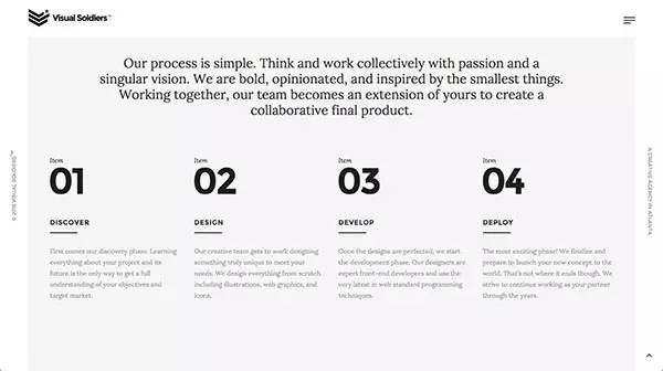 Visual Soldiers 和 Tomasz Wysocki 的网站都是这样,优雅而干练的色调是它们的基因。简练的布局和独特的品牌定位,使得它们无需鲜艳的色彩来呈现CTA按钮和边角的菜单,安静的白与黑就足够了。
