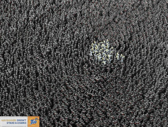 表现:白色棒球队围歼红色棒球队、黑武士围歼白武士、警察围歼小偷以拟人的方式来表现去污不留痕。