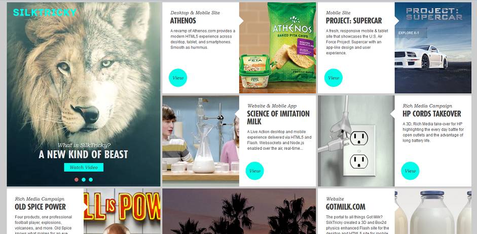 卡式设计带来了简洁,但与此同时也必须强调一点,那就是内容的丰富性。这在一定基础上必须保证页面能提供足够多的页面内容来引导用户,否则用户只会感到茫然。[Silk Tricky](Silk Tricky )的网站完美地平衡了简洁性和内容丰富性,它让两个相邻卡片之间共同展示同一内容,一图一文,又削减掉页面因平铺的画面而显出的单调。它还利用了“VIEW”的高亮按钮来提醒和吸引用户点击进入详细。