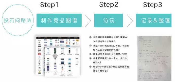 做到“知彼”还不够,还要“知己”。很多设计师都有这样的烦恼,辛辛苦苦做出来的设计稿,在领导眼里却是各种问题,甚至要推翻重来。除了视觉表现能力外,大部分的情况是因为对产品的理解和认知与他人不一致造成的。怎样既能充分了解对方高屋建瓴的产品理念,又能避免被对方不专业的设计意见牵着走呢?这里我们使用一种“预访谈”的方式(我们给这种方法起了个名字叫“投石问路”)。