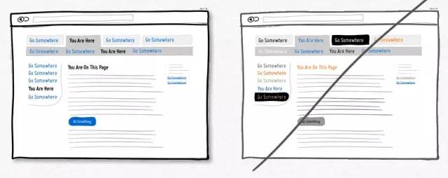 视觉风格,如颜色、深度和对比度都可以当做可靠的线索以帮助人们了解你的导航界面:我在哪里,我能去哪里。为了让用户清晰,可点击元素(链接,按钮)、已选择元素(选择的菜单)、以及纯文本的样式应该是彼此明显不同,而且在界面上要保持一致性原则。在视觉上,我们一般认为蓝色表示可被点击,黑色表示已被选择或是什么。