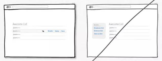 直接在元素身上进行操作是更直观明了的方式。比如在一个列表中,我们想让用户对每个条目进行操作那么就把按钮放到当前条目上,而不要把放到列表之外。再比如就是直接点击元素就进入编辑状态(比如页面上的地址信息点击后可以进行编辑)。这种方式比传统的选中再点击相应的按钮进行操作要简洁省事得多。当然,对于一般性的操作本身就不需要有什么上下文的,就没必要这么做了,比如页面上的前进,后退按扭。