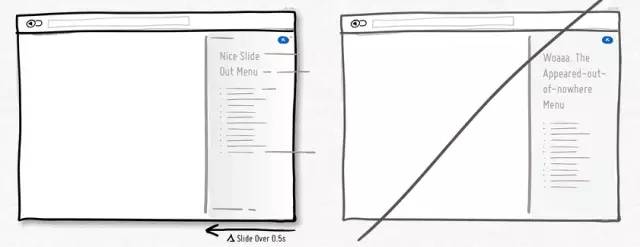 用户进行操作过程中,界面上的元素会经常出现,隐藏,打开,关闭,放大缩小移位等。给这些元素增加些自然的动画,淡入淡出效果不但美观,也更符合实际,本来元素尺寸位置的变化就是一个需要时间的动画过程。但要注意动画时间不要设置过长,那样会让想尽快完成操作的用户不耐烦。