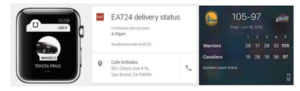 通知会以更「智能」的形式出现,不会是现在的小广告推送形式,也不会是类似 Widget 常驻的形式,而更接近「手表屏幕」大小,按需出现,可交互的、功能相对完整的界面(即使是在手机上而不是手表上),用户甚至可以永远不打开一个 App,而能够享受 App 提供的全部功能。