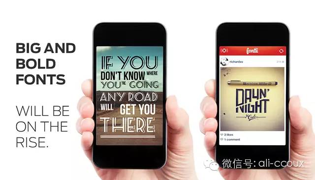 随着滚动式浏览方式的普及,以内容为核心的设计思路,在界面设计上会愈加明显,没有过多修饰的排版结构,不再盲目追求将很多内容挤在一屏以内,反之是加大间距和行高,让用户的阅读更加聚焦,享受到沉浸式体验。大屏手机的流行,也促进了大字体在移动端APP上流行的节奏,大字体会赋予界面以层次,提高特定元素的视觉重量,让用户难以忘怀。字体够大、够优雅、够独特、够贴合,也就能提升页面的气质和特色,而这正是移动端APP设计的另外一次重要的机会。