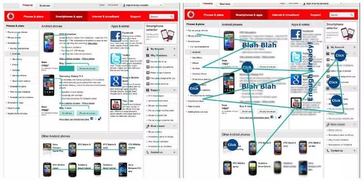 几年前,我正忙于一个移动端网站,并且需要搞清楚用户在浏览网站的时候都在干什么。测试的时候,我们动用了视觉追踪系统来了解用户浏览的时候会看什么、找什么,并且如何同网站进行交互的。当我们给测试用户一个目标任务,比如购买手机,或者去技术支持页面的时候,我们开始仔细观察。