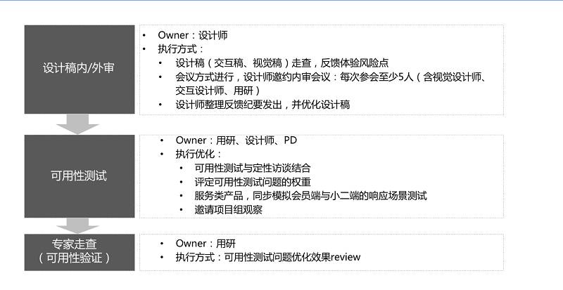 设计环节对产品体验的影响至关重要,另外多说一句,产品体验更多的是设计师和用研要共同把握的,用研对于不明确的体验设计方向给予设计师思路引导和验证,设计师是真正实现体验表现的掌舵手。从体验保障的角度来看,在设计环节,设计师的每次方案产出都可以通过「会议讨论」或「背靠背」走查方式对方案进行调整,同时对高保真 Demo 进行用户可用性测试,保障在批量开发之前的设计方案体验。