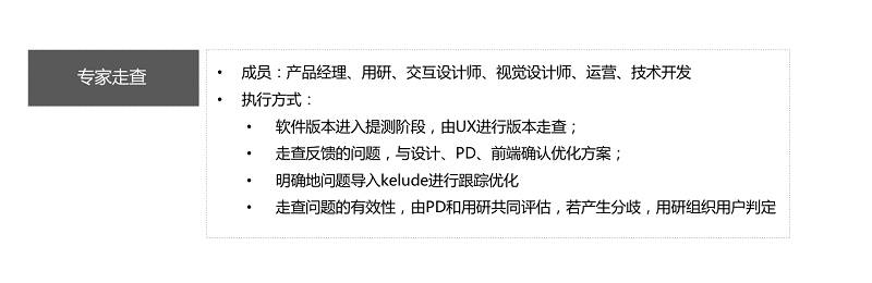 开发环节的时间有限,设计师与用研、前端工程师的互动极为重要。若是终端产品,在此节点有比较长的周期,可以通过组织用户试用的方式来收集产品的体验不足和需求反馈;但对于互联网产品的快速迭代开发,势必是不可取,因此有经验的设计师和用研组织的专家走查便起到了重要作用,此解决方案在设计Demo的基础上,基于更真实的实现状态走查软件体验的不足并实时优化,也是一种基础体验保障的托手。