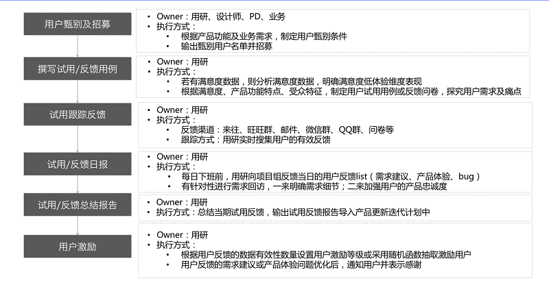 对于互联网产品而言,产品的上线也许是新的体验需求的开始,快速的版本迭代,允许互联网产品试错、纠错。因此,上线后的需求搜集和反馈及产品满意度监测,是重中之重。上线后的用户试用或真实用户的开放式反馈,都是下一版本迭代需求落地的强输入,也是产品持续迭代闭环的关键「纽扣」!常用的用户试用反馈流程梳理机制如下图: