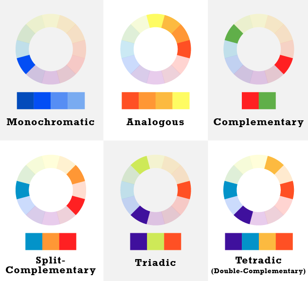 传统的色轮上有12种色彩,但是常用的配色方案有很多,系统的配色理论中对于如何借助色轮来创建配色方案有比较系统的介绍,比如大家所熟知的单色方案、相似色方案、对比色方案、对称三色方案等等。