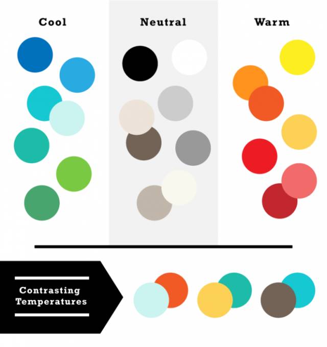 色彩都有着不同的色温,黑白灰是中性色(米色和棕色有时候也会被归类与中性色),红色、橙色是暖色调,蓝色、绿色是冷色调。不同色温的色调在一起的时候能够形成不错的对比度。