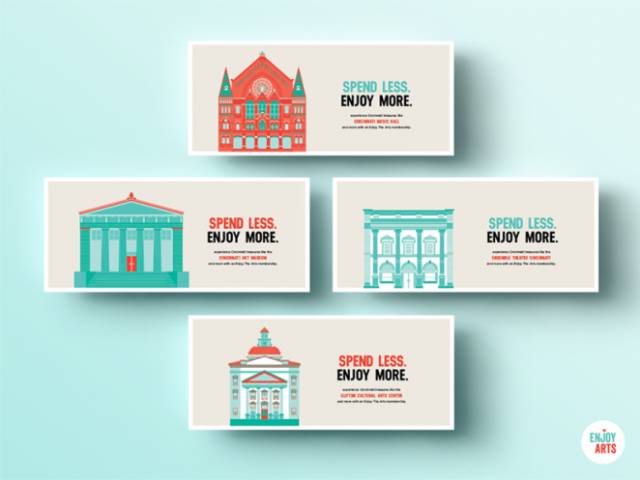 案例中是一组辛辛那提的明信片设计,虽然整个建筑物是明信片中最大的视觉元素,但是哪些“Enjoy More”的文字在视觉上更加突出,那就是视觉重心。