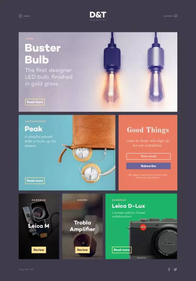不同于使用单一字体家族所追求的一致性设计,讲究对比度的字体组合往往会使用不同类型的字体搭配。不过这样的设计有一些地方值得注意:如果要对比度,那么字体一定要有明显的差异,只有这样才有区分度。不同字体应对不同的职能,不要在同样的功能区使用不同的字体,这样会造成混乱。一般而言,使用一个衬线体和一个非衬线体来搭配是个不错的选择。下面的案例就是这么做的。