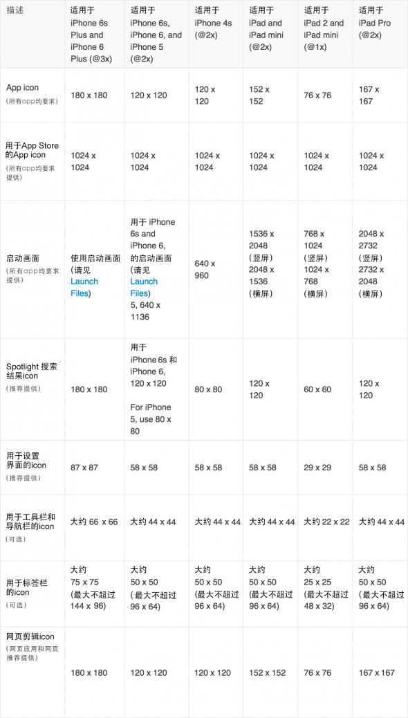 每个app都需要icon,以及启动画面,此外一些app需要一些自定义图标用于导航栏、工具栏和标签栏中,来代表app特有的内容、功能或模式。表格45-1所罗列出来的尺寸可以为自定义图标和图片做参考。