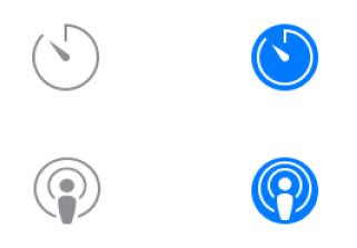 有时候给予选中态一些细微的变化令其有更好的显示效果。例如计时器和播客的图标都包含一些开放的区域,所以选中态将其描边略微缩小并放在了一个圆圈内。