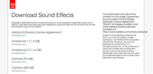 Adobe提供的免费音效,非常丰富,包括环境氛围、卡通、人物、自然、科技等近30个类别,重点是直接免费下载,可商用。