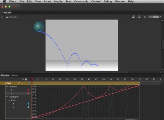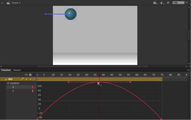 关键帧2(时间轴=3秒)小球属性:X=500,Y=0,透明度=0%,旋转=360度