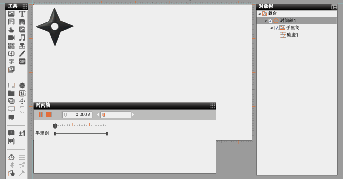 这样时间轴播放的时候,飞镖就会同时变化X和透明度的值,实现向右运动并旋转消失的效果。