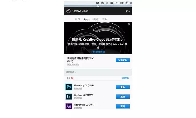 4、安装完成后,在顶部菜单栏的右侧,可以看到Creative Cloud图标,单击即可看到Adobe Creative Cloud的主界面,如下图所示。