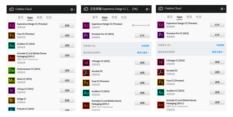 5、在Apps选项卡中,找到Experience Design CC(Preview),单击右侧的安装按钮,等待片刻即可完成安装。如下图所示。