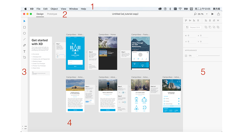 为了方便说明,我们单击界面2,打开范例文档,看到Xd主界面如下图所示。同样为了说明用数字进行标注。