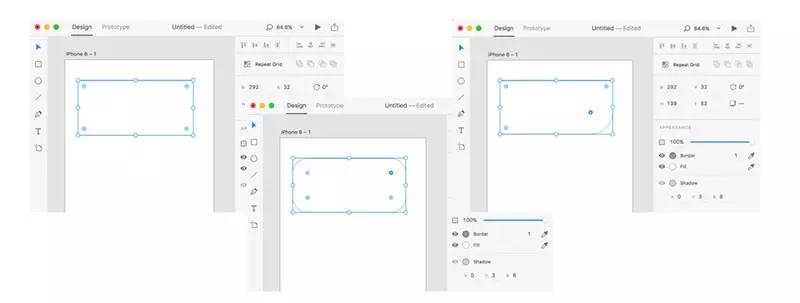 了解完了整体界面再来看看各工具如何使用。为了方便讲解,新建一个以iPhone 6为默认画板的文档,并使用快捷键R,选择矩形工具。在画板上按下并拖动即可绘制矩形,拖动时按住shift键可以绘制正方形,按住option键可以以中心点开始绘制矩形。绘制完矩形如下图左侧所示。