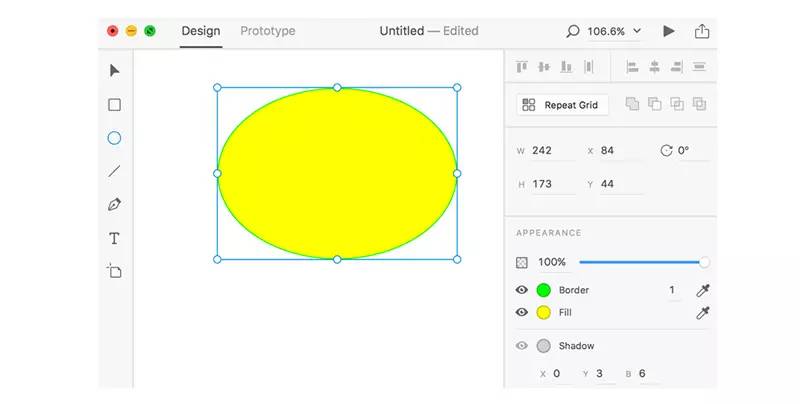 使用快捷键E,可以使用椭圆工具,在绘制椭圆时按住键盘上的shift键可以绘制正圆,按住option键可以从中心点开始绘制。椭圆图层的检查器和矩形图层的检查器相似,唯一的区别在于椭圆图层没有圆角半径属性。