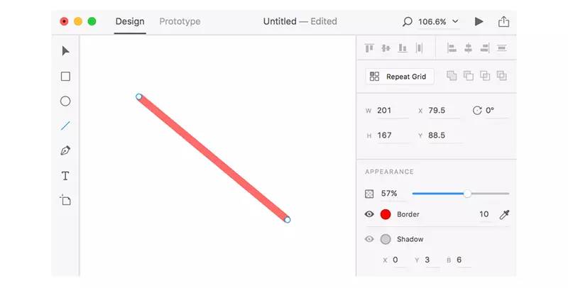 使用快捷键L,可以使用线条工具,按住shift键并拖动可以绘制水平、垂直和45度角的线条。在右侧检查器中Border的宽度可以调节绘制的线条的粗细。
