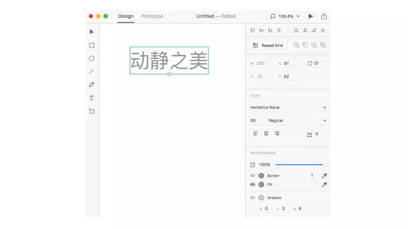 使用快捷键T,可以创建文本,在画板上单击即可输入文字,输入完文字后在文字之外的任意区域单击即可退出编辑模式。选中文本后右侧的检查器TEXT区域可以设置字体、字号、字重、文本对齐方式和字间距。