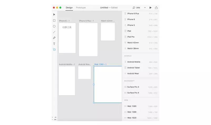 界面1,可以快速创建需要设计设备的文档,系统内置了iPhone 6、iPad和1080p的尺寸,大家也可以在第四个Custom Size处自定义设备尺寸。